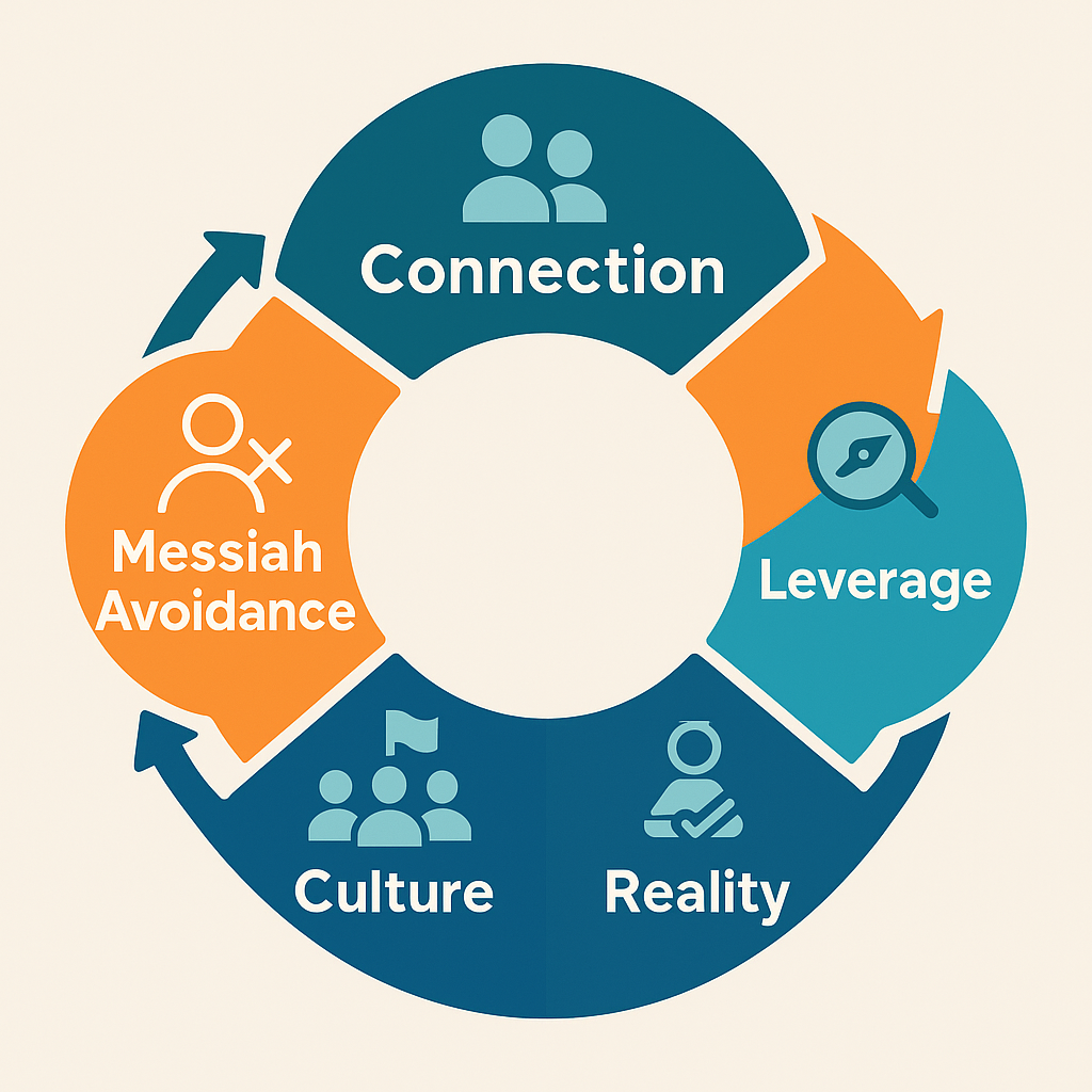 Connection → ends the Messiah dynamic → builds Leverage (themes, systems, capacity) → shapes Culture that carries strategy → stays honest via Reality (facts, tests, better questions).