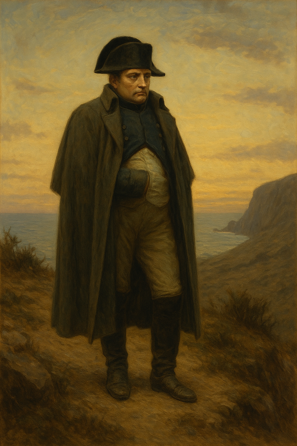In a modest drawing room, Napoleon Bonaparte sits by a fireplace, wrapped in a military cloak. There are no aides. No maps. Only the smell of damp parchment, scorched tea, and salt air. He looks up—his face more lined than legend often allows—and motions to the empty chair beside him.